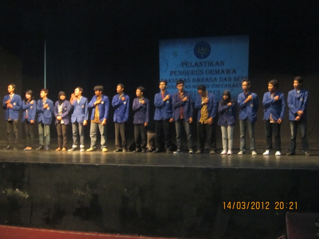 Pelantikan pengurus ormawa FBS UNY dilaksanakan pada tanggal 14 Maret 2012, bertempat di Stage tari FBS UNY. Acara dibuka oleh Wakil Dekan II. Meskipun sempat ngaret, namun secara keseluruhan acara berlangsung cukup lancar dan meriah. Diawali dengan sambutan-sambutan, dilanjutkan dengan pengambilan sumpah yang dipimpin oleh Dekan FBS UNY. Acara selanjutnya yaitu pemotongan tumpeng, sebagai ungkapan syukur, serta dilanjutkan talkshow dengan jajaran dekanat.